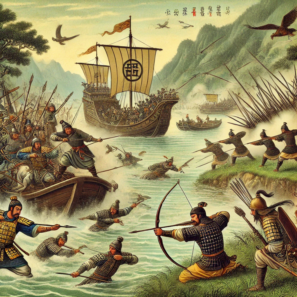 황조는 강가에 활과 쇠뇌병을 매복시켜 두고 손견의 배가 강가에 닿자마자 화살을 마구 쏘아댔다.