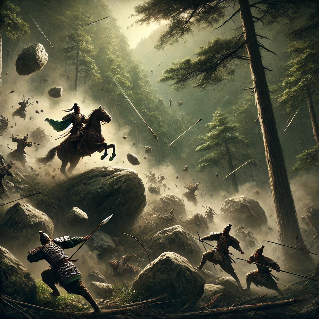 손견이 산을 오르려는 순간, 갑자기 징소리가 울리더니 산 위에서 돌들이 무수히 굴러 내리고, 숲 속에서는 화살이 빗발치듯 날아왔다.