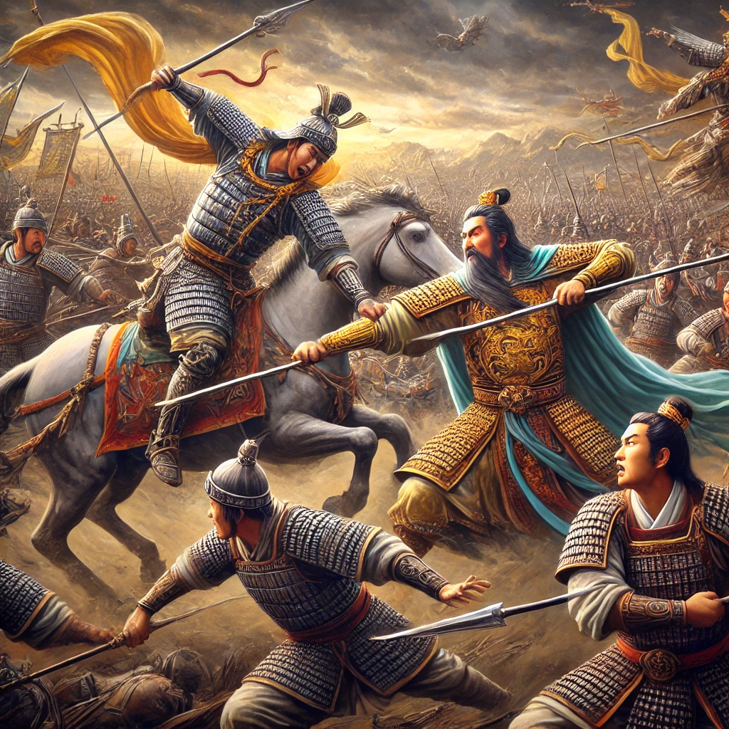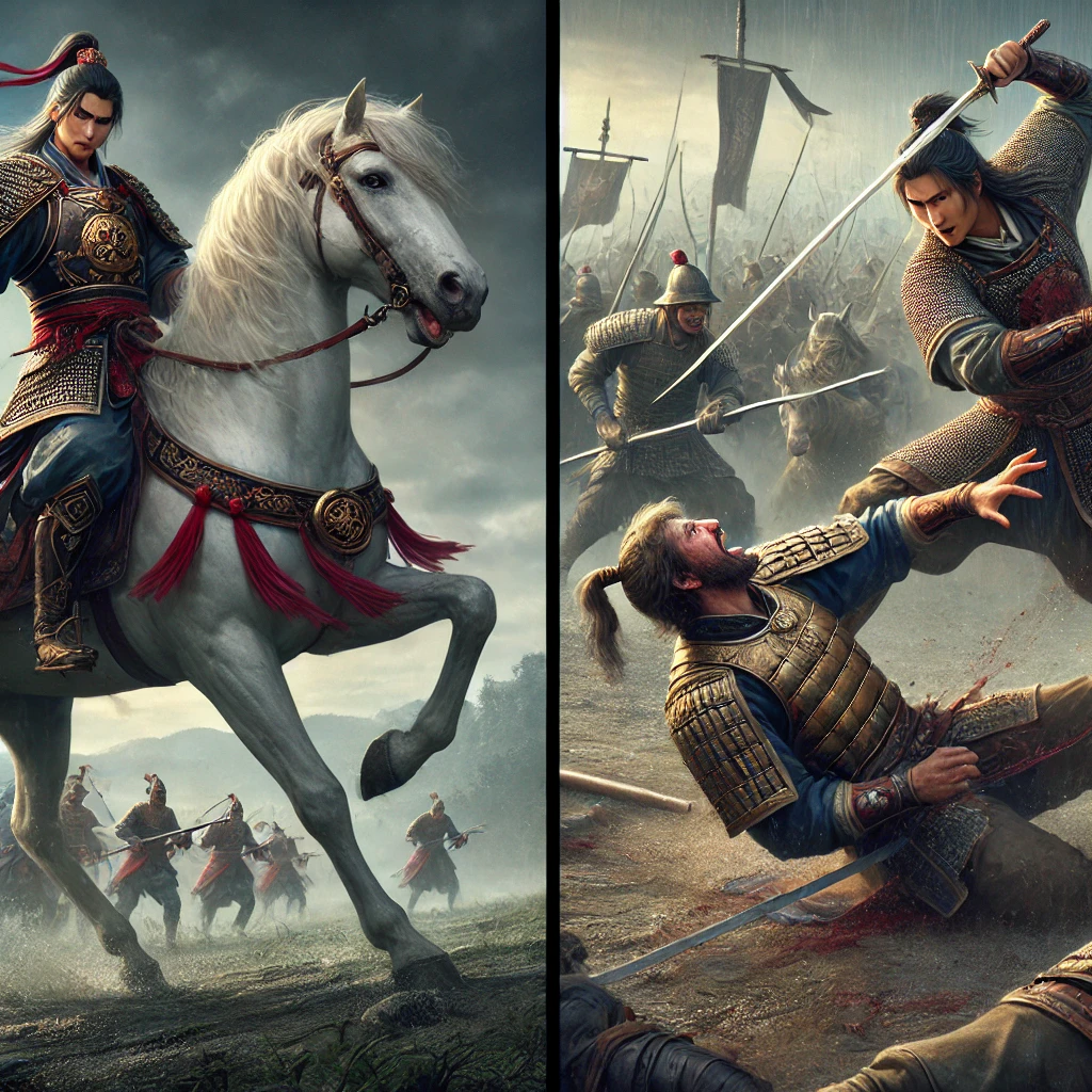 이때 세 마리의 말에 각기 다른 무기를 들고 나는 듯이 빠르게 달려와 원소를 직접 공격하였다.