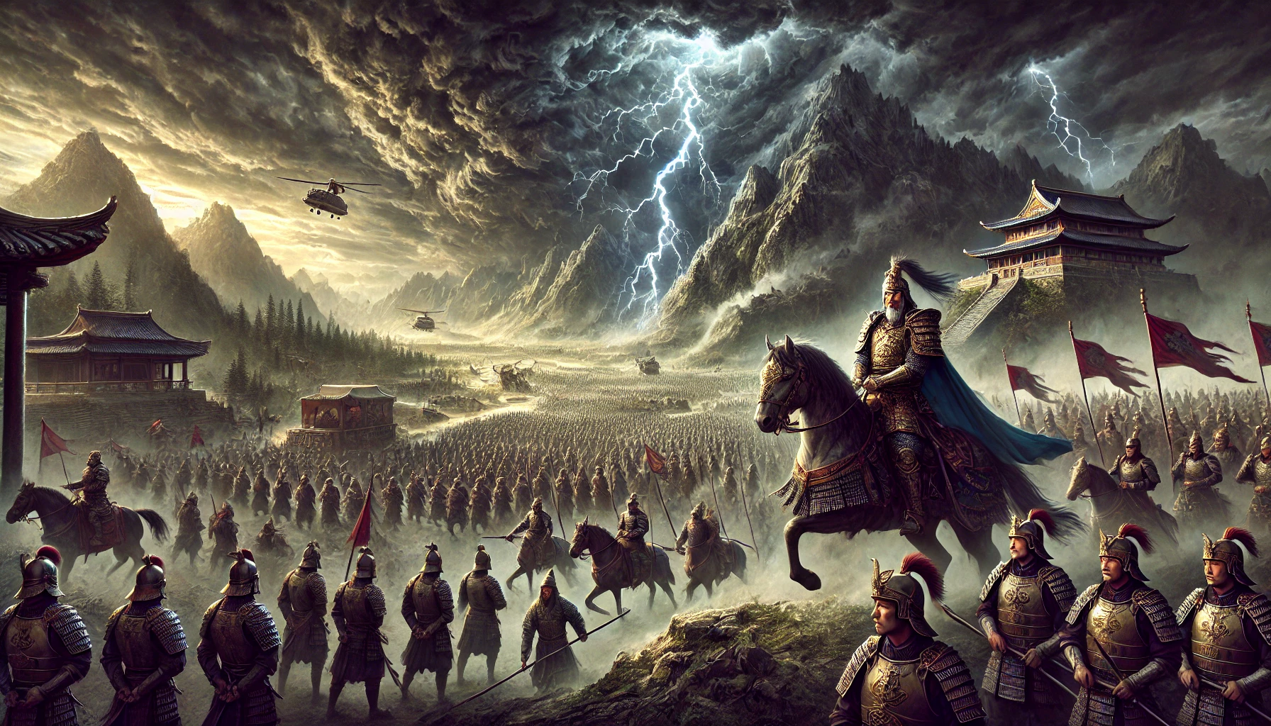 그러던 중, 문득 먼지 바람이 해를 가릴 만큼 일더니, 한 무리의 대군이 앞을 막아서 왔다.
