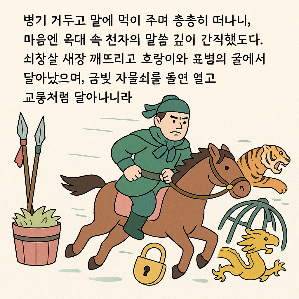 병기 거두고 말에 먹이 주며 총총히 떠나니,