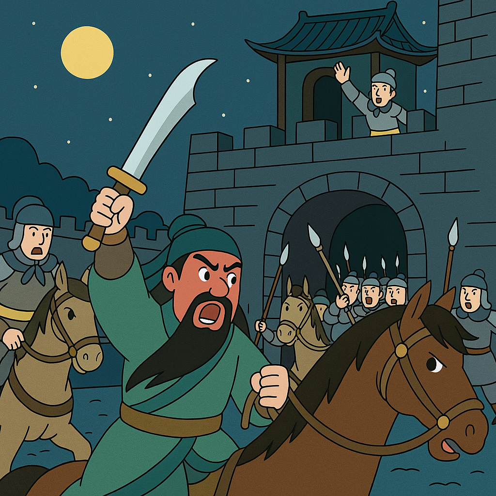 관우는 차주의 머리를 베어 높이 들고, 성을 향해 외쳤다.